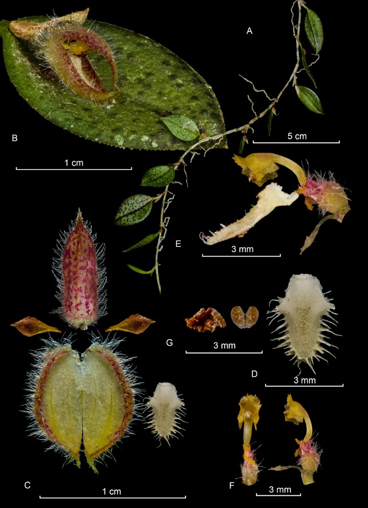 Los detalles de la planta indican que, su hoja alcanza a medir máximo tres centímetros, sin embargo, en general es similar a una enredadera, que en su longitud puede superar los tres metros. En cuanto a la flor, que mide tan solo un centímetro, cabe anotar que tiene pequeños pétalos de color naranja, dos sépalos muy visibles y un labelo de unos tres milímetros, que es la característica más representativa de las orquídeas. La flor reposa sobre las hojas que nacen de la enredadera.