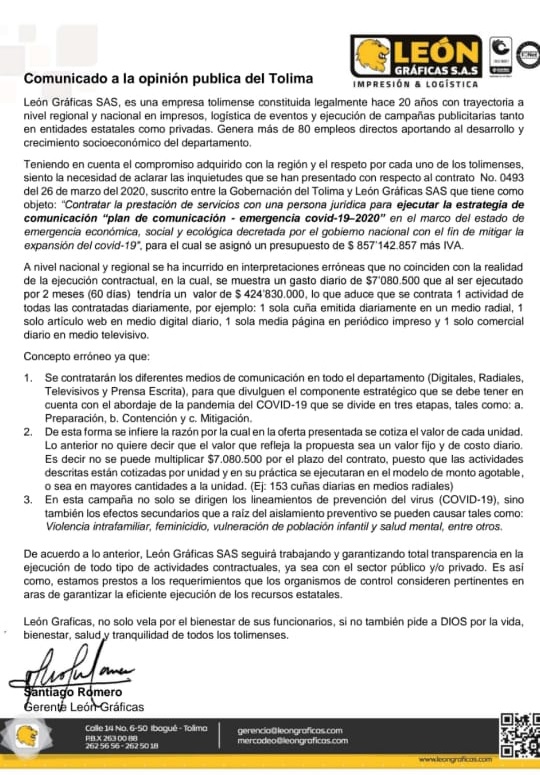 El gerente de la empresa León Gráficas, Santiago Romero, en comunicado a la opinión pública, en referencia al contrato suscrito con la Gobernación del Tolima en el marco del estado de Emergencia Económica y que tiene como objeto ejecutar la estrategia de comunicación que contribuya a mitigar la expansión del covid-19, afirma que se han hecho interpretaciones erróneas alrededor del contrato.