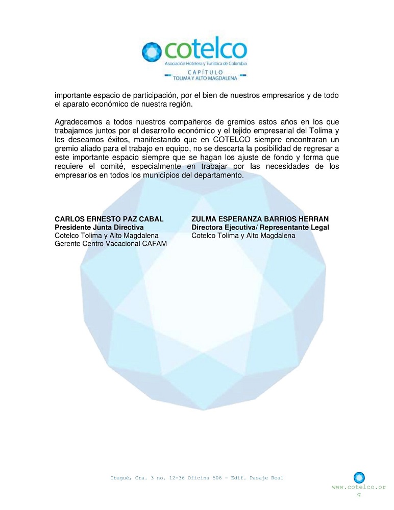El comunicado que está firmado por Carlos Ernesto Cabal, presidente de la Junta Directiva de Colteco Tolima y Alto Magdalena, además de gerente de Centro Vacacional Cafam. Y Zulma Esperanza Barrios Herrán, directora ejecutiva de Cotelco, dice en uno de sus apartes que "no podemos ser convidados especialmente en espacios en donde todos los gremios deben intervenir".