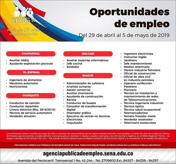 Hasta el 5 de mayo, estarán dispuestas las nuevas vacantes que han sido registradas por los empleadores en la última semana, las mismas estarán vigentes para esta semana en el aplicativo de la Agencia Pública de Empleo del Sena Tolima, para lo que se necesita que los buscadores de empleo actualicen su información y además validen los soportes de formación académica y experiencia laboral.