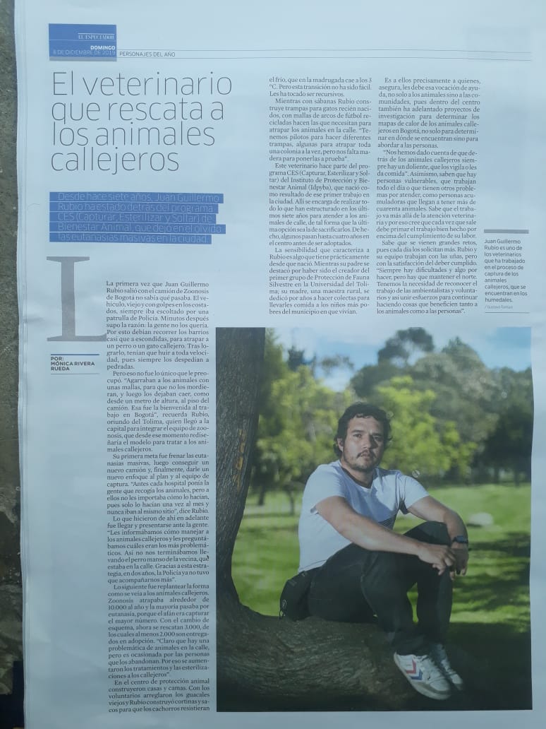 “El veterinario que rescata a los animales callejeros”, así tituló El Espectador en una página completa que le dedicó a Juan Guillermo Rubio Vallejo como uno de los personajes del año 2019 en Colombia, en la edición dominical del pasado 8 de diciembre, es decir seis días después de haber cumplido 34 años de edad.