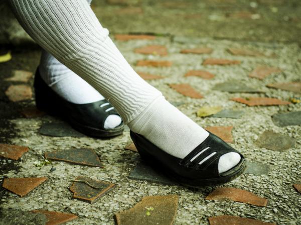 Ángela viste sus piernas con medias de colegiala y suele llevar sandalias de cuero o tacones. Foto: Camilo OsorioMientras Miguel Ángel se iba convirtiendo en un hombre maduro, sobre los 40 años, experimentó una situación que solo pudo resolver en la intimidad de su fe. “Cuando llegué a tener pleno conocimiento de las cosas y al ver que no podía consumar el deseo de mi corazón, durante muchos años guardé mucho odio contra las mujeres y contra la sociedad porque no podía consumar el deseo de mi corazón de ser una muchacha”, dice.