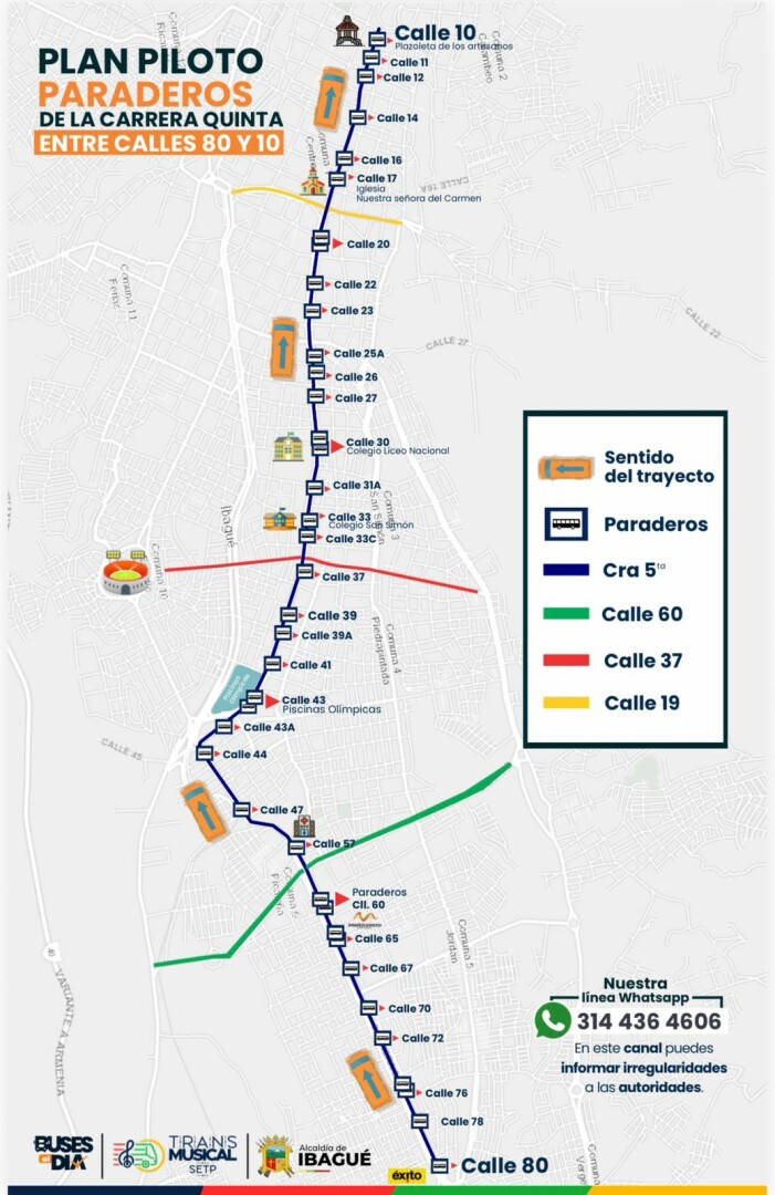 La Alcaldía de Ibagué anunció el inicio de un plan piloto de paraderos de buses en la carrera Quinta del Sistema Estratégico de Transporte Público, SETP, ‘TransMusical’, con el propósito de fortalecer la cultura ciudadana, mejorar la movilidad en esta importante avenida y optimizar el servicio de transporte colectivo en la ciudad.