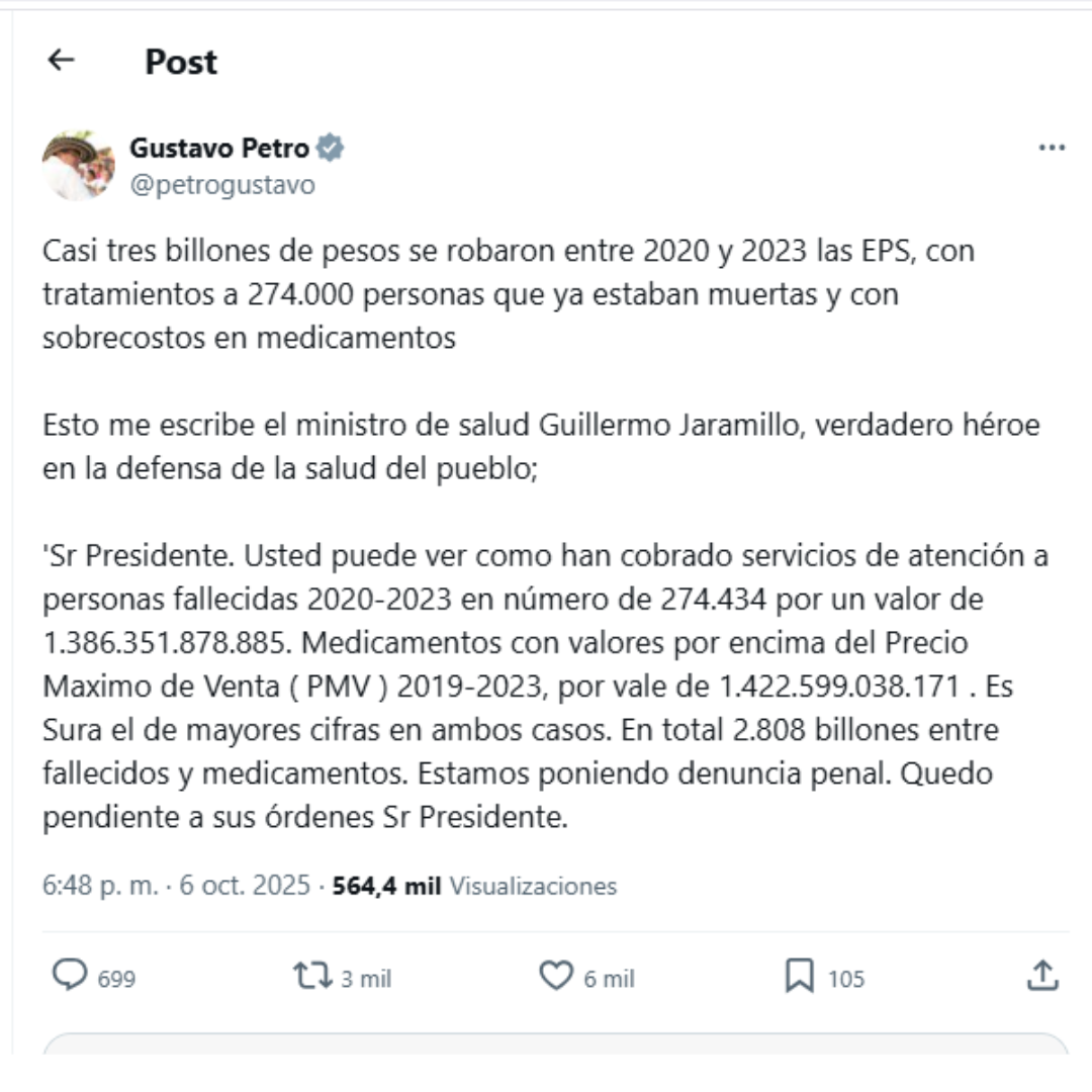 "Casi tres billones de pesos se robaron entre 2020 y 2023 las EPS, con tratamientos a 274.000 personas que ya estaban muertas y con sobrecostos en medicamentos", aseveró el mandatario en su cuenta de X.