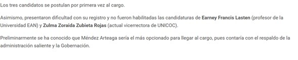 Asimismo, señaló que algunos escenarios académicos convocados para la comunidad universitaria han contado principalmente con la presencia del profesor Méndez, excluyendo a otros candidatos y reforzando la idea de favorecimiento.