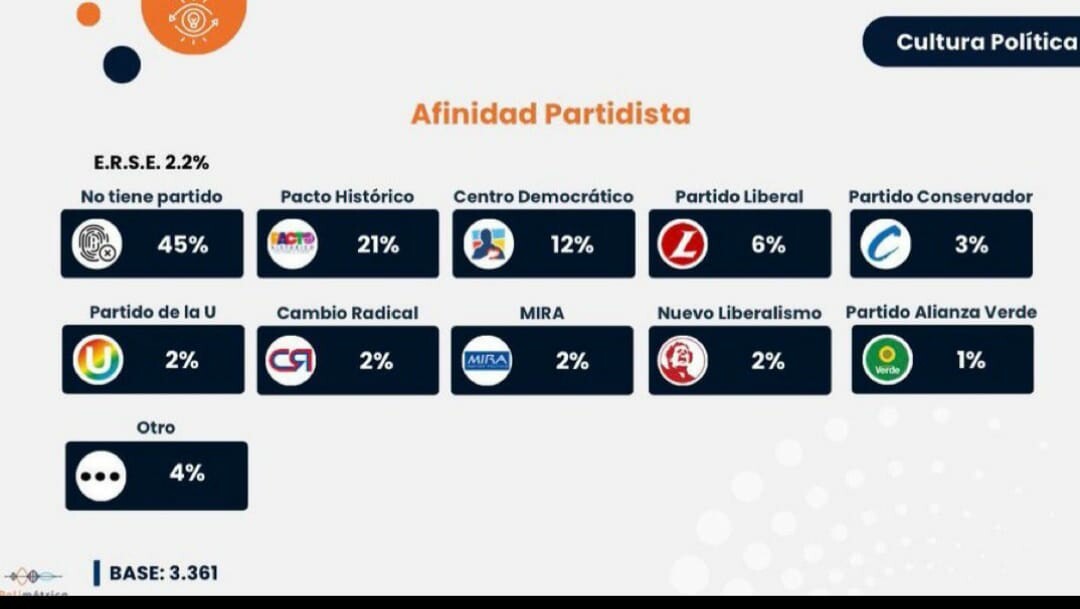 Dentro de los resultados que registra la encuesta se destaca que en afinidad partidista, el 45% de los consultados respondió no identificarse con ningún partido. Sin embargo, el Pacto Histórico es el partido que saca mayor afinidad, con un 21 %; el Centro Democrático, 12 %; el Partido Liberal, 6 % y el Partido Conservador solo alcanza un 3 %.