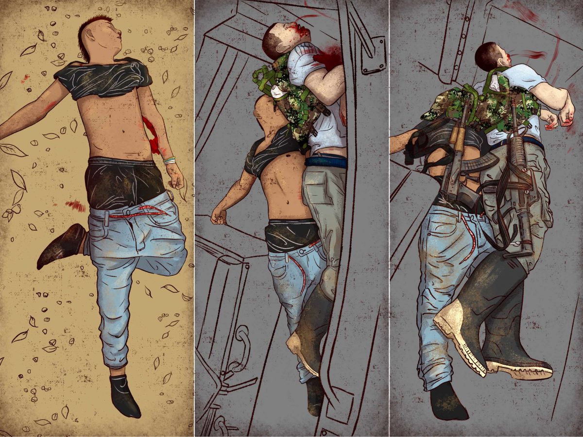 Las fotos, que hacen parte del expediente de la investigación y que no publicamos por ser imágenes en extremo sensibles (ver ilustraciones que las reproducen de manera fidedigna), fueron analizadas por un experto forense. Su dictamen dice que la camisa de Brayan Santiago fue jalada. Asegura que las armas que se ven en la piraña fueron puestas. “La primera foto es la de la lancha. (…) Hay restos de pasto en las manchas de sangre. (Los impactos) no fueron con tiros de fusil. Los cuerpos fueron subidos a la lancha posteriormente a su asesinato. Al lado derecho se ven huellas de arrastre”.