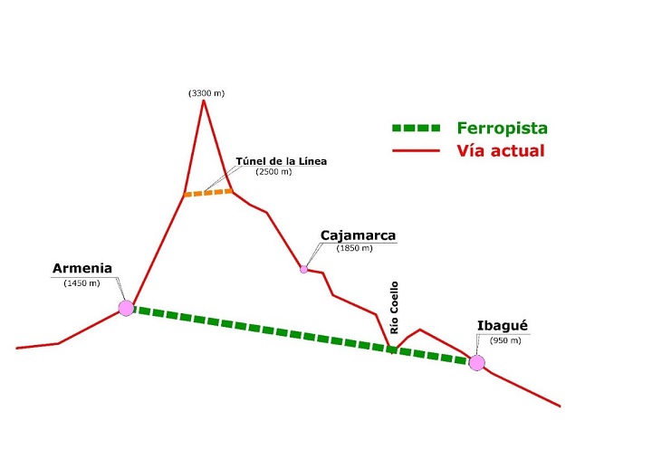 De acuerdo a la página web este sistema de enlace ferroviario conectará a Armenia con Ibagué mediante la construcción de un tramo de vía férrea de 55 kilómetros de longitud total con un túnel base de 44,2 km bajo la cordillera central.