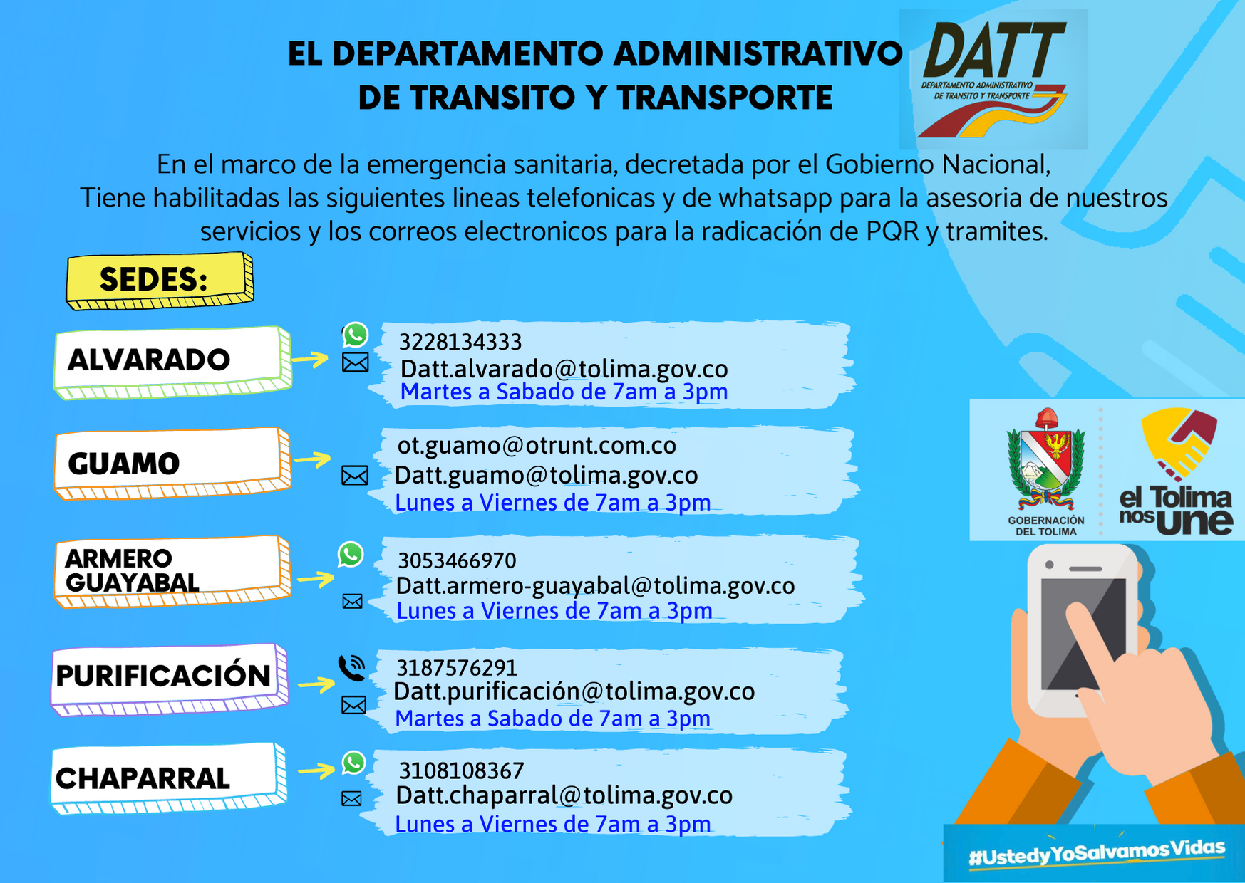 “Trabajamos para salvar vidas. Llegaremos a todos los rincones de nuestro departamento con un mensaje de sensibilización vial, para garantizar que en nuestras vías se reduzcan las cifras de siniestros viales y no irrumpan en la vida de los tolimenses.” Puntualiza Carlos Barrera Prada, director del DATT.