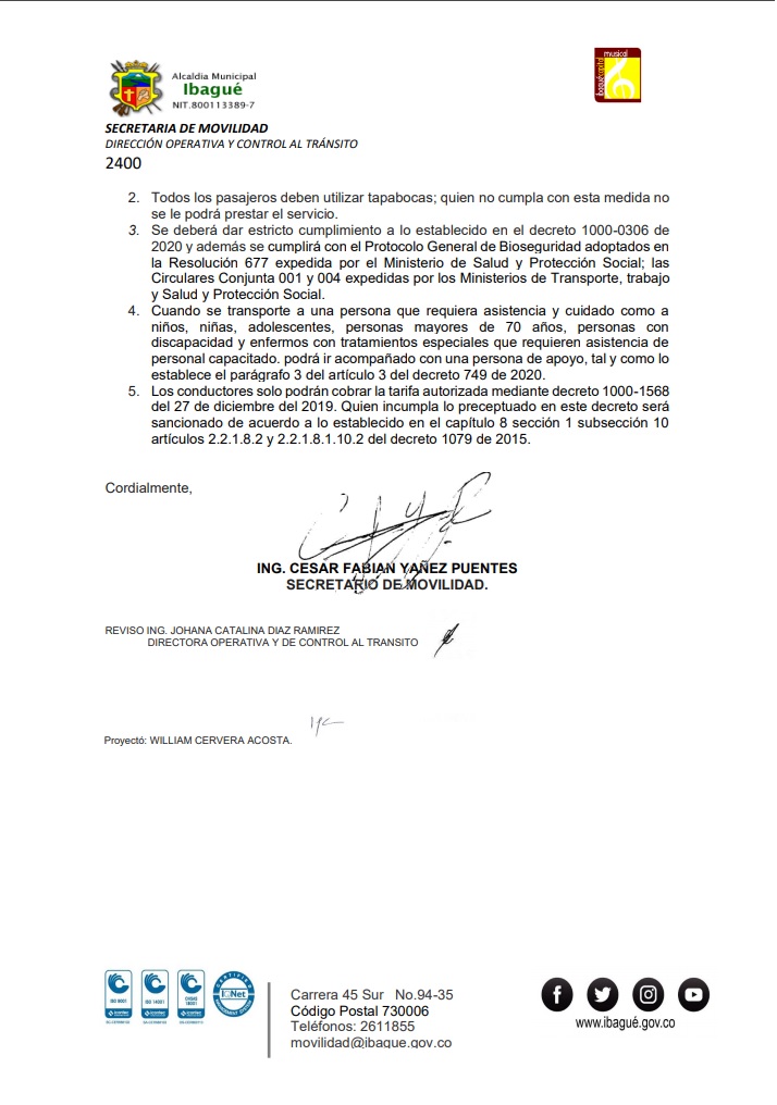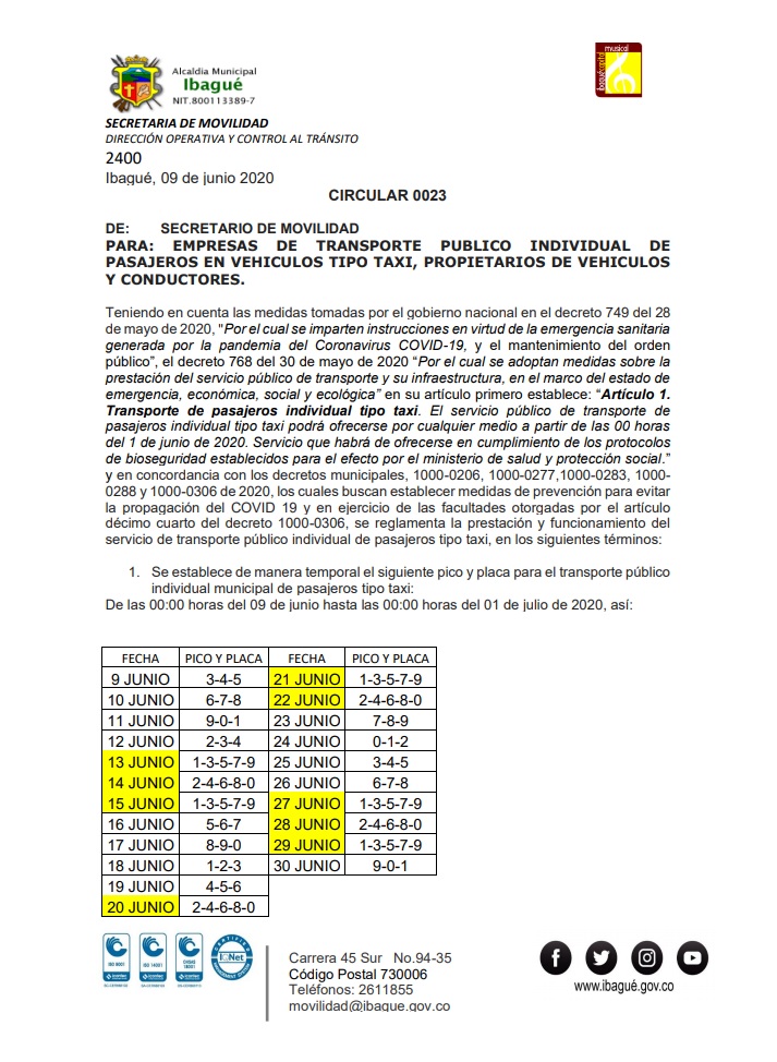 La Secretaría de Movilidad, de manera concertada con el gremio de taxistas, emitió la Circular 0023 en la que regula la operación del transporte público individual durante el aislamiento preventivo.