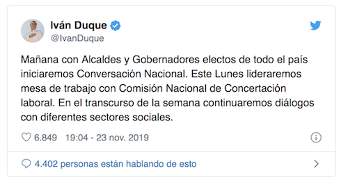 El mandatario de los colombianos Iván Duque mediante un trino indicó que iniciará los diálogos el domingo, tres días antes de lo anunciado, con los alcaldes y gobernadores electos que asumirán sus cargos en enero. En una semana donde además se empieza a discutir el aumento del salario laboral para el 2020.