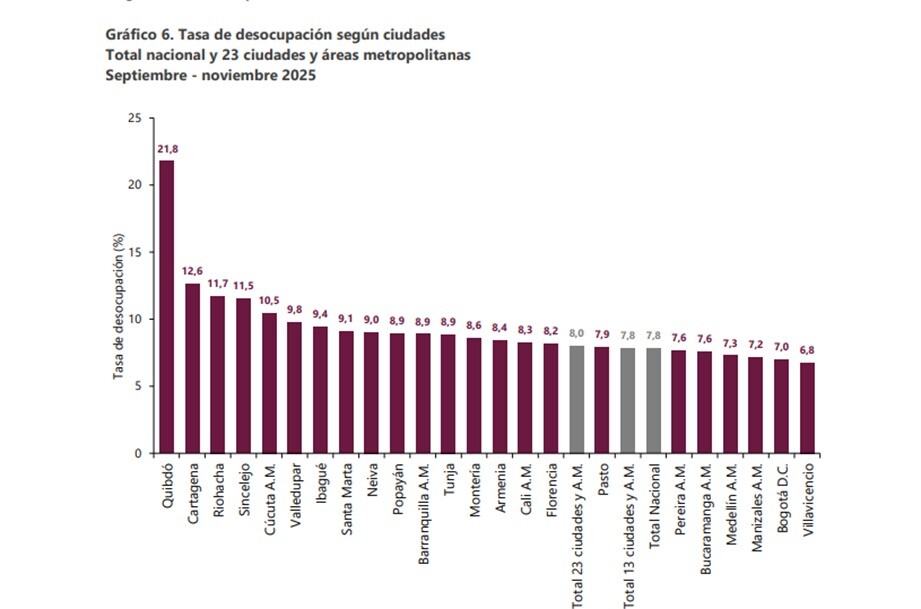 Para el trimestre móvil septiembre - noviembre 2025, de las 23 ciudades y áreas metropolitanas, las que presentaron mayores tasas de desocupación fueron: Quibdó (21,8%), Cartagena (12,6%) y Riohacha (11,7%). Las ciudades con menor tasa de desocupación fueron: Manizales A.M. (7,2%), Bogotá D.C. (7,0%) y Villavicencio (6,8%). Ibagué registró 9.4%.