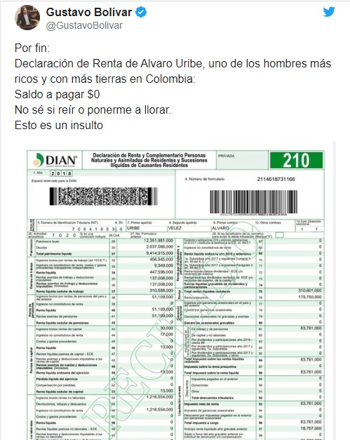 "Por fin declaración de renta de Álvaro Uribe Vélez, uno de los hombres más ricos y con más tierras en Colombia: saldo a pagar $0. No sé si reír o ponerme a llorar. Esto es un insulto".