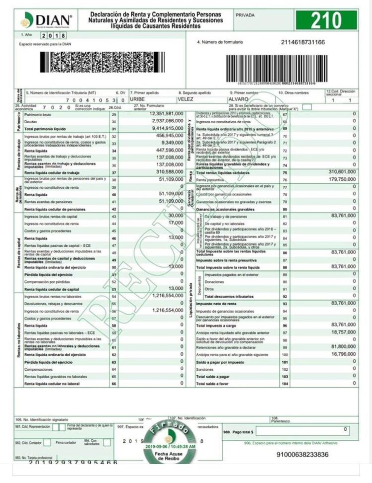 De acuerdo al documento, el expresidente Álvaro Uribe tiene un patrimonio bruto de $12.351’981.000 millones, deudas por $2.937’066.000 y un patrimonio líquido de $9.414´915.000. El saldo a pagar fue de cero pesos, ya que hizo un pago anticipado de $80.000.000 por retención en la fuente y, además, contaba con un salgo a favor del año pasado.