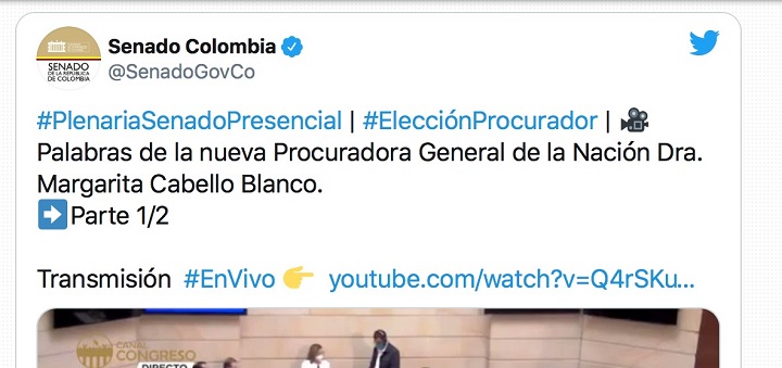 Recalcó luego de conocer la votación que "este apoyo que ustedes hoy me dan lo entiendo como un reconocimiento a una vida profesional pulcra y responsable al servicio de la justicia. Lo entiendo también como una exaltación a las mujeres de Colombia que hemos logrado ascender peldaño a peldaño para conquistar espacios de la vida pública y privada que hasta hace algunos años eran una aspiración lejana y hoy son una conquista y una esperanza para millones de mujeres que luchan a diario por alcanzar posiciones que sus madres y sus abuelas nunca imaginaron".