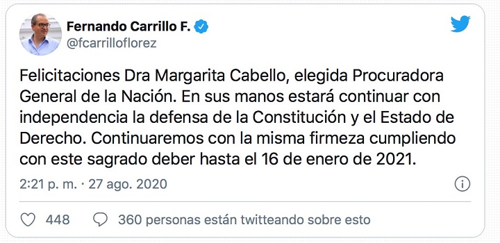 La nueva Procuradora tomará posesión de su cargo el próximo 16 de enero de 2021. "No haré declaraciones hasta que asuma las funciones como nueva Procuradora", indicó Cabello Blanco.
