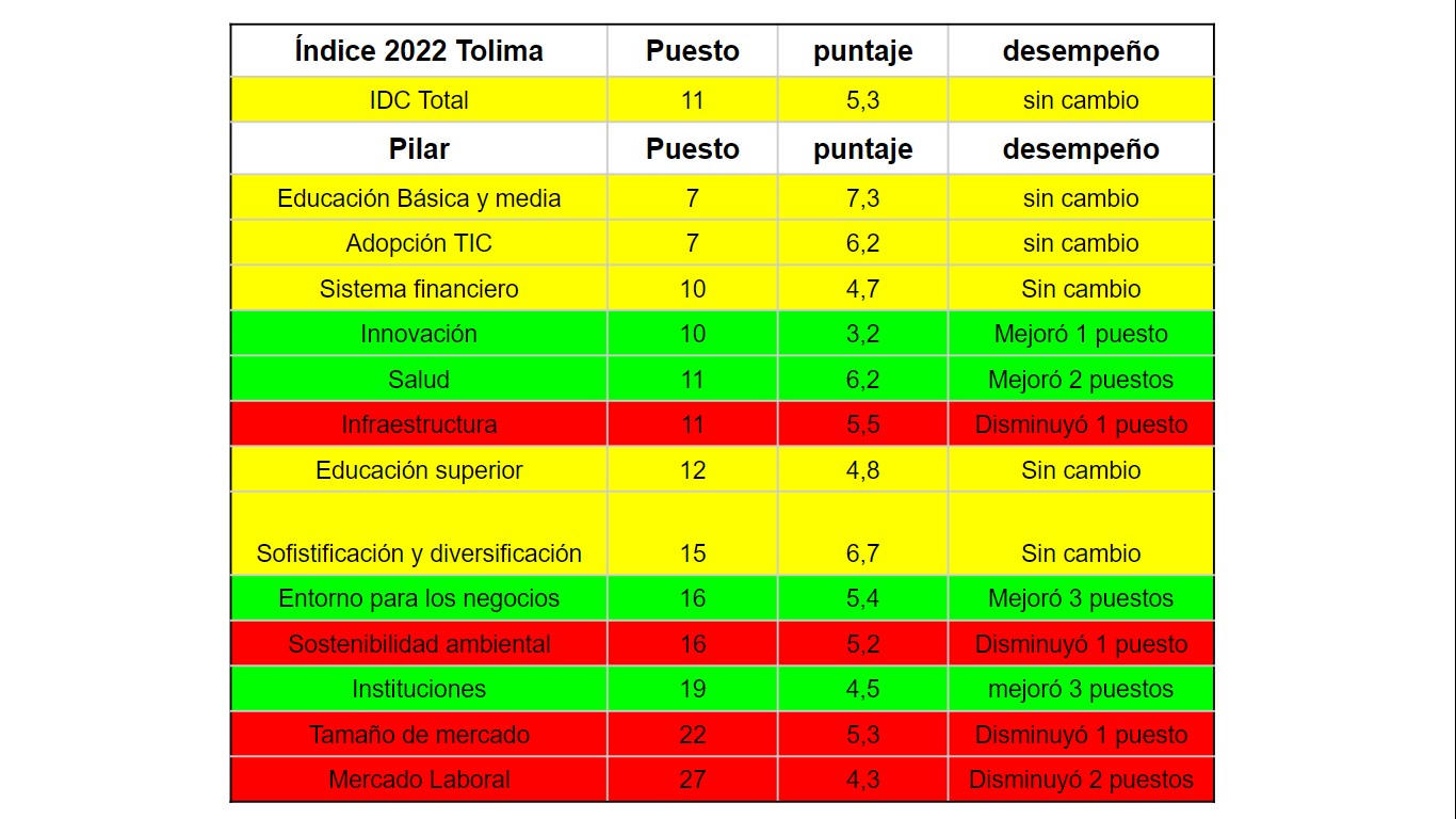 El índice departamental de competitividad y el de ciudades muestra al Tolima y a Ibagué en el puesto once respectivamente, si se revisa al detalle, muchos de los subpilares estudiados por el índice tienen un bajo desempeño.