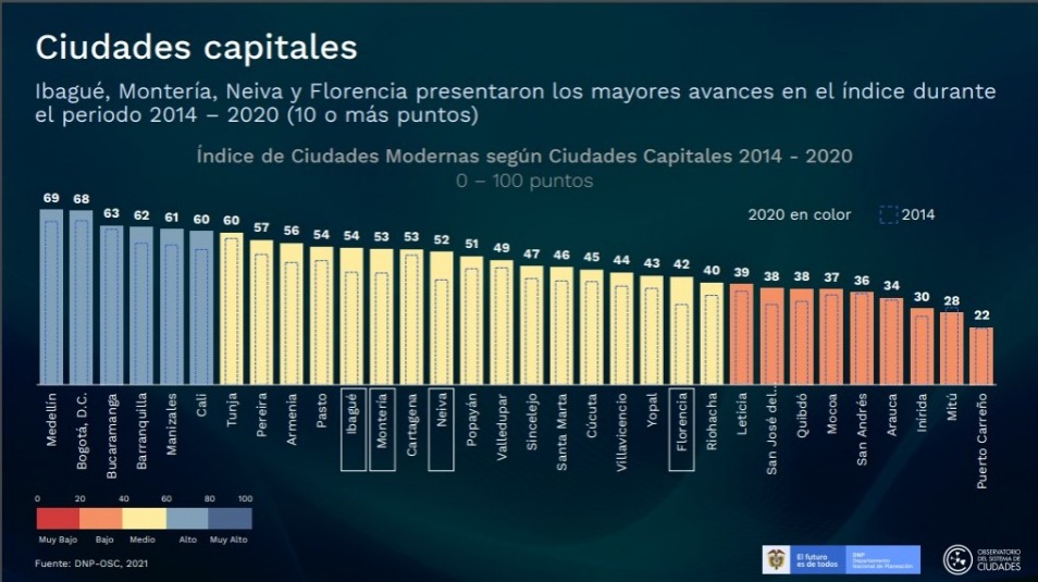 Ibagué, Montería, Neiva y Florencia presentaron los mayores avances en el índice durante el periodo 2014 – 2020, y aunque Ibagué pasó de un nivel bajo a medio, el desempeño de los municipios es bajo.