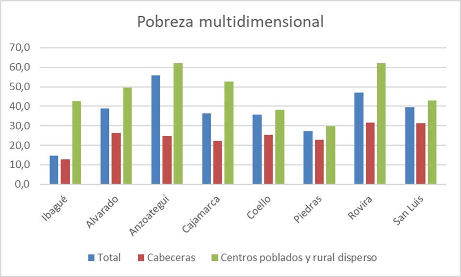Minimizar las brechas entre ciudades capitales y los municipios cercanos posibilita mayores sinergias y mejora la calidad de vida. Para el caso de Ibagué y los municipios vecinos, las brechas son significativas. Un par de ejemplos son pobreza multidimensional y cobertura bruta en educación.