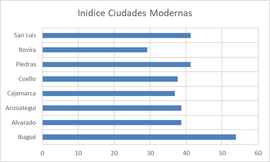 La divergencia de modernidad entre los municipios de la subregión Ibagué-Centro también es significativa. Ibagué es la única que tiene un desempeño medio en el índice de ciudades modernas por encima de 50 puntos, seguida de Piedras y San Luis, mientras que el resto de municipios tienen un desempeño bajo, siendo Rovira el municipio con mayor rezago.  Existe una alta dispersión en el desarrollo municipal al interior de la subregión.