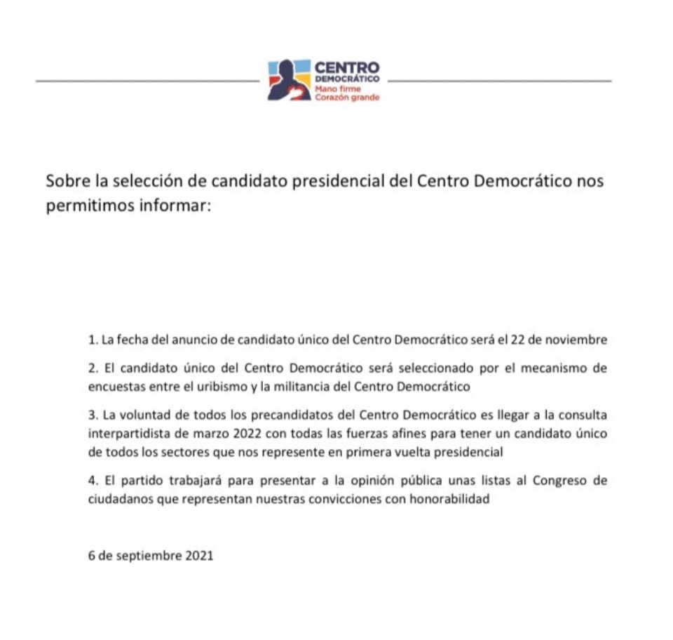 En el comunicado de prensa divulgado a través de redes sociales ratifica como fecha de anuncio de su candidato el próximo 22 de noviembre y será a través del mecanismo de encuesta entre el uribismo y la militancia del Centro Democrático.