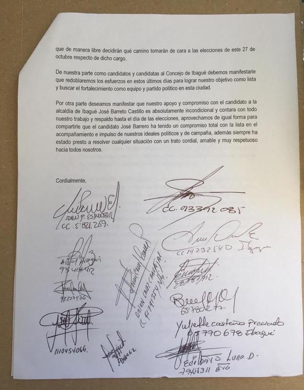 Al finalizar la carta reiteran su compromiso con el candidato a la alcaldía de Ibagué José Barreto Castillo, con quien redoblarán esfuerzos hasta el 27 de octubre esperando a consolidarse como una nueva fuerza política en la ciudad y el deparamento dicen los 13 aspirantes que firmaron.