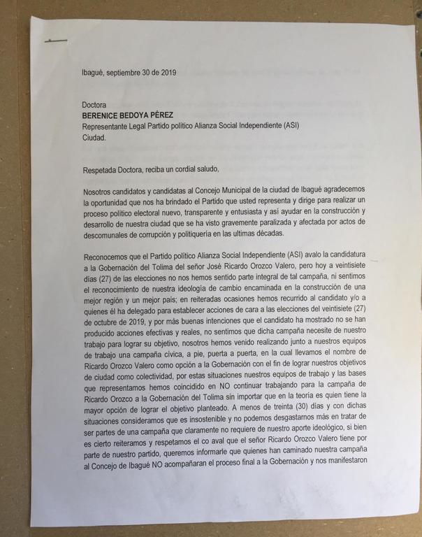 Justifican su retiro debido a la indiferencia con que han sido tratados por el candidato, dice la misiva que agrega: “Reconocemos que el partido político Alianza Social Independiente ASI avaló la candidatura a la gobernación del Tolima del señor José Ricardo Orozco Valero, pero hoy a 27 dìas de las elecciones no nos hemos sentido parte intetral de tal campaña, ni sentimos el reconocimiento de nuestra ideología de cambio encaminada en la construccion de una mejor región y un mejor país”.