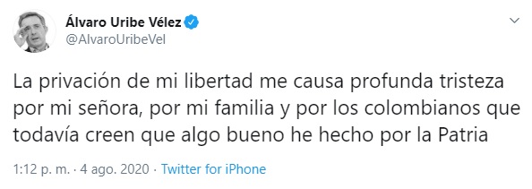 "La privación de mi libertad me causa profunda tristeza por mi señora, por mi familia y por los colombianos que todavía creen que algo bueno he hecho por la Patria", dijo Uribe.