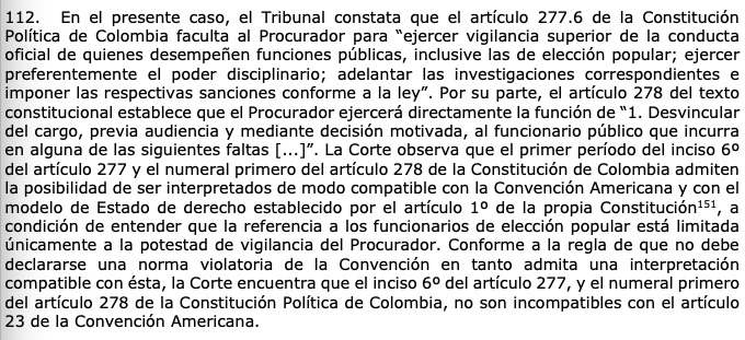 El aparte fundamental del fallo señala: “La Corte ya concluyó anteriormente que una sanción de inhabilitación o destitución de un funcionario público democráticamente electo por vía de autoridad administrativa y no por ‘condena, por juez competente, en proceso penal’, es contraria a la Convención (Pacto de San José) y al objeto y fin de la Convención. Por las mismas razones, la Corte concluye que el Estado (Colombia) incumplió con sus obligaciones previstas en la Convención, por la existencia y aplicación de las normas del Código Disciplinario que facultan a la Procuraduría a imponer dichas sanciones a funcionarios públicos democráticamente electos, como fue el caso del señor Petro”, dice la sentencia de la Corte IDH.