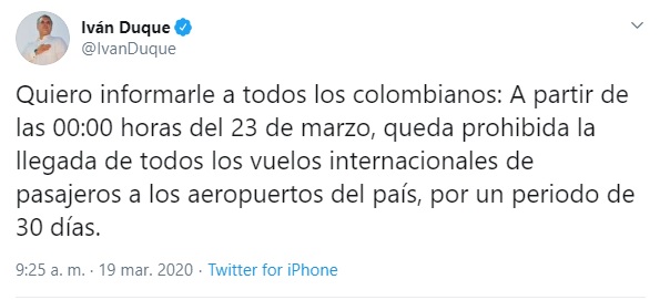 En su cuenta de Twiter, el presidente Duque precisa que la prohibición de la llegada de todos los vuelos internacionales de pasajeros cobija a todos los aeropuertos del país y será por un periodo de 30 días.