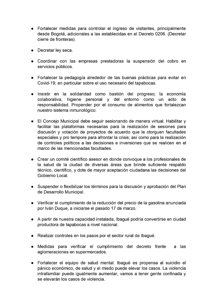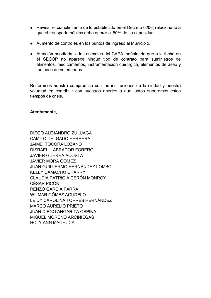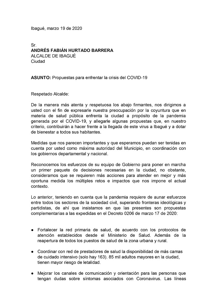 Un grupo de ciudadanos, entre los cuales se encuentran exsecretarios de la administración del exalcalde Guillermo Alfonso Jaramillo, como César Picón y Juan Diego Angarita, el diputado Renzo García, de Alianza Verde, entre otros, le proponen al alcalde Andrés Hurtado, el fortalecimiento de la red de salud, mejorara canales de información a la ciudadanía, medidas para evitar el acaparamiento, entre otras.