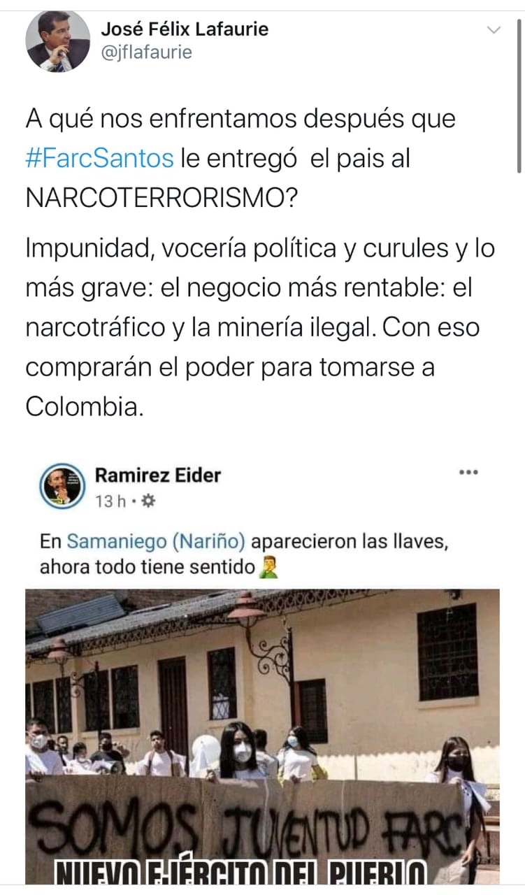 Fuerte polémica se desató este lunes por cuenta de José Félix Lafaurie, presidente ejecutivo de Fedegán, quien compartió en su cuenta de Twitter una fotografía y un mensaje que tildaba de "juventud Farc" a los habitantes de Samaniego, municipio de Nariño donde hace una semana asesinaron a nueve jóvenes.