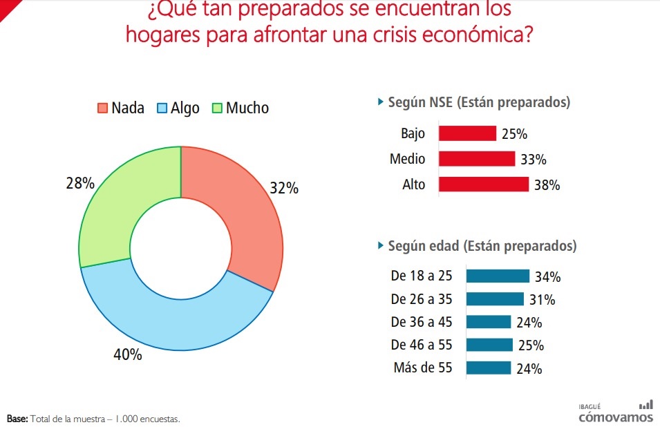 Hacia finales del año anterior, el 53% de los ibaguereños se mostraban preocupados por el futuro de la economía en la ciudad; mientras que, el 72% no se consideraba preparado para afrontar una crisis económica.