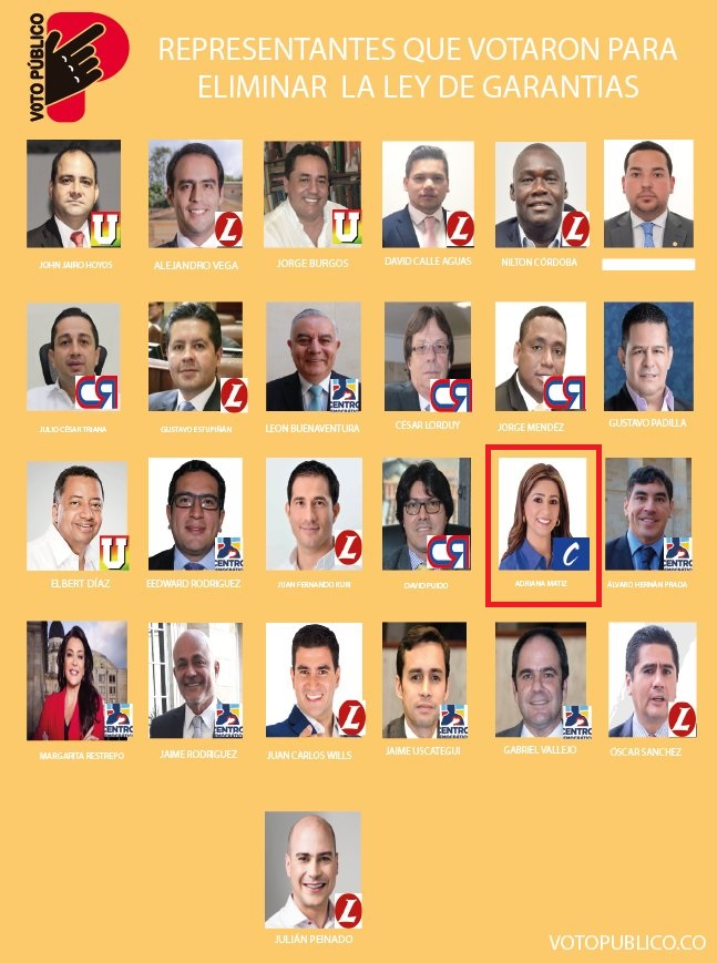 El portal votopublico.co, que hace seguimiento a las votaciones del Congreso, divulgó una lista de Representantes que, según ellos, estuvieron de acuerdo con eliminar dicha Ley. Entre los 25 congresistas, figura la representante por el Tolima, Adriana Magali Matiz. Las críticas de los cibernautas no se han hecho esperar.
