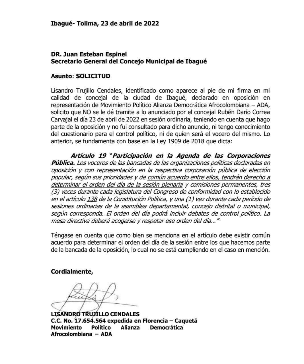 Sobre la convocatoria de la sesión especial realizada por Correa al amparo del artículo 19 de la ley 1909 de 2018, la normatividad reza que la misma se podrá invocar por “los voceros de las bancadas de las organizaciones políticas declaradas en oposición”. Y para el caso del Partido ADA en Ibagué, existe una declaración firmada por Rubén Darío Correa y Lisandro Trujillo, desde enero del 2020 donde acordaron una vocería rotativa de la bancada por año. Señala el documento conocido por este medio que en la vocería arrancó Correa en el 2020 y se pactó que Trujillo lo haría en el 2021. Y sucesivamente de la misma manera para los años 2022 y 2023. Por lo que Correa es el actual vocero de la bancada del ADA.
