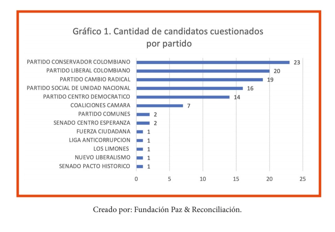 Por partidos, la investigación de La Fundación Paz y Reconciliación dice que el Partido Conservador respalda 23 candidaturas cuestionadas, el Partido Liberal, 20; Cambio Radical, 19; el partido la U 16 y Centro Democrático 14. En la lista al Senado por el Centro Esperanza dos nombres cuestionados y en el Pacto Histórico, uno mientras en la listas en coalición a nivel de Cámara aparecen siete cuestionados.