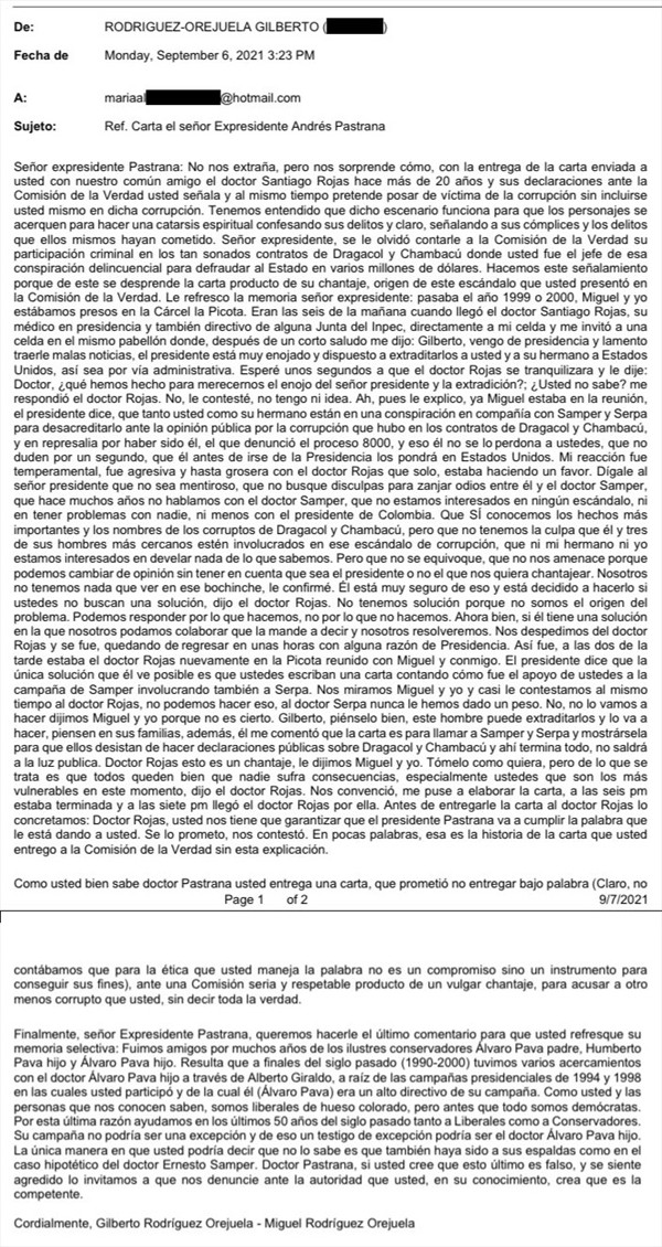 En lo que atañe a las acusaciones de chantaje que le hacen al expresidente Pastrana, señalan que estas se realizaron a través del médico personal de palacio doctor Santiguo Rojas. Dice inicialmente la carta de los Rodríguez: “Señor expresidente Pastrana: No nos extraña, pero nos sorprende cómo, con la entrega de la carta enviada a usted con nuestro común amigo el doctor Santiago Rojas hace más de 20 años y sus declaraciones ante la Comisión de la Verdad, usted señala y al mismo tiempo pretende posar de víctima de la corrupción sin incluirse usted mismo en dicha corrupción. Tenemos entendido que dicho escenario funciona para que los personajes se acerquen para hacer una catarsis espiritual confesando sus delitos y claro, señalando a sus cómplices y los delitos que ellos mismos hayan cometido".