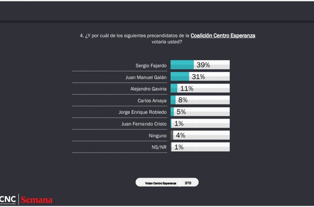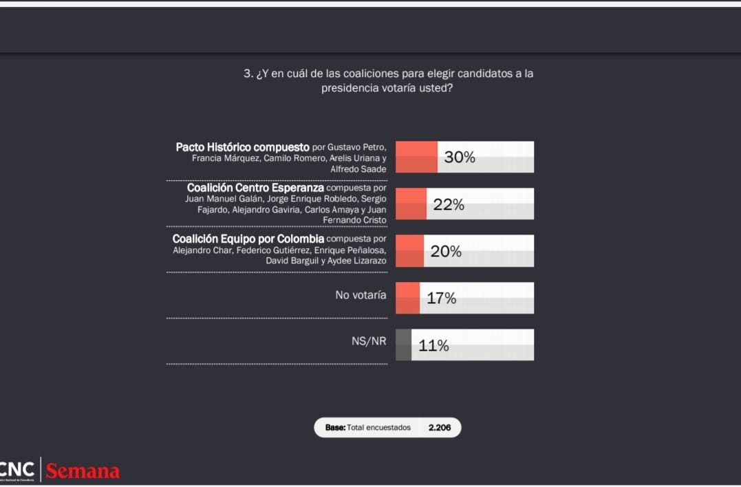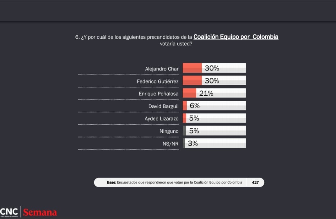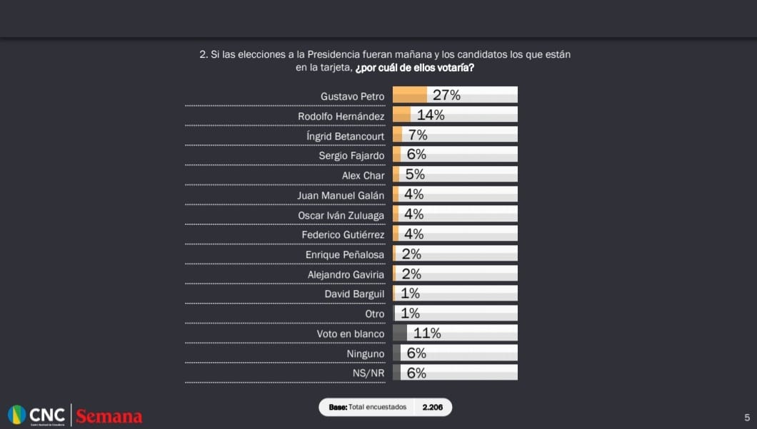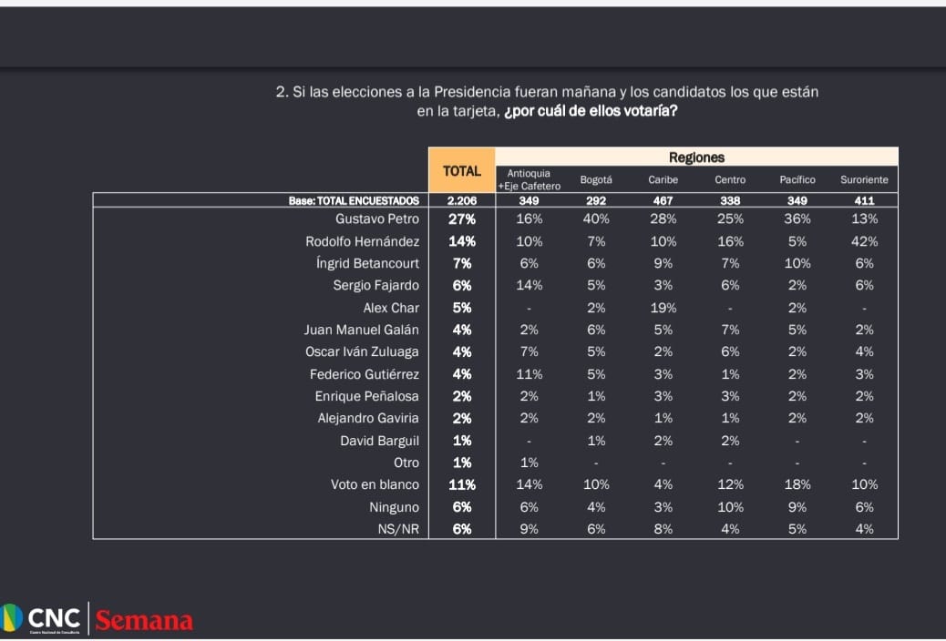Gustavo Petro lidera lidera la encuesta con el 27 %. Le siguen Rodolfo Hernández (14 %), Ingrid Betancourt (7 %), Sergio Fajardo (6 %), Álex Char (5 %), Juan Manuel Galán (4 %), Óscar Iván Zuluaga (4 %), Enrique Peñalosa (2 %), Alejandro Gaviria (2 %) y David Barguil (1 %).