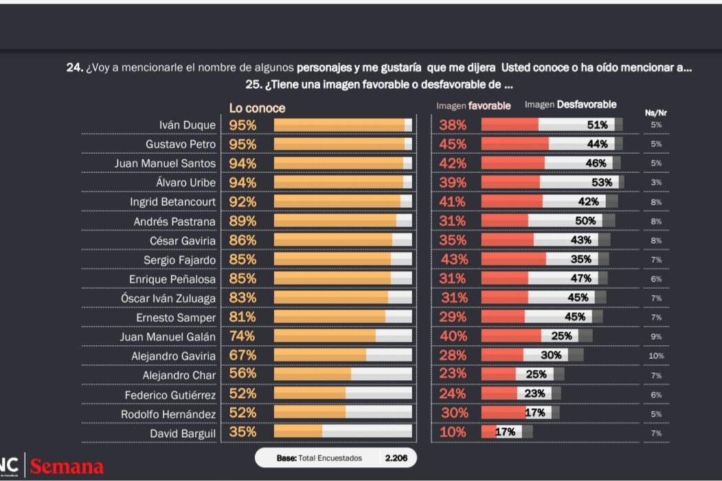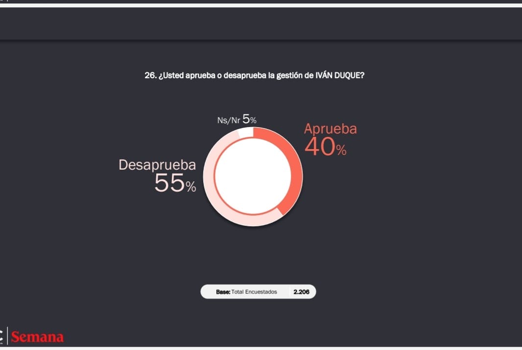 En la encuesta se le preguntó a los colombianos sobre la gestión del presidente Iván Duque. El 55% de los encuestados la desaprobó, solo el 40% aprobó la gestión. En cuanto a imagen favorable y desfavorable, llama la atención que Gustavo Petro supera al expresidente Álvaro Uribe. Mientras Petro saca el 45% de imagen favorable, el expresidente Uribe solo llega al 39%; en imagen desfavorable, Petro obtiene 44% mientras Uribe llega al 53%.