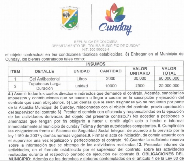 Por ejemplo, el alcalde de Cunday, Luis Gabriel Pérez Rivera, compró 2000 litros de gel antibacterial a razón de 30 mil pesos unidad, para un total de 60 millones, cuando estos tienen un precio en el comercio entre 12 y 15 mil pesos, y en la distribuidora El Mayorista de Melgar, según su publicidad el medio litro vale 6 mil 900 pesos; es decir, que el litro tendría un costo de 13.800 pesos.