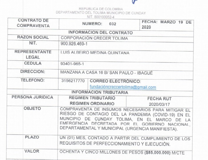 Pero lo más curioso de esta contratación de Cunday, es que se hace con un completo desconocido en el suministro de este tipo de elementos de salud y aseo: Luis Albeiro Medina Quinta, residente en la manzana A casa 18 B del barrio San Pablo de Ibagué, quien al ser consultado por El Cronista,co sobre este lesivo contrato contra las finanzas del municipio, dijo que no podía hablar porque una de las cláusulas del contrato le impedía. ¡Qué descaro!