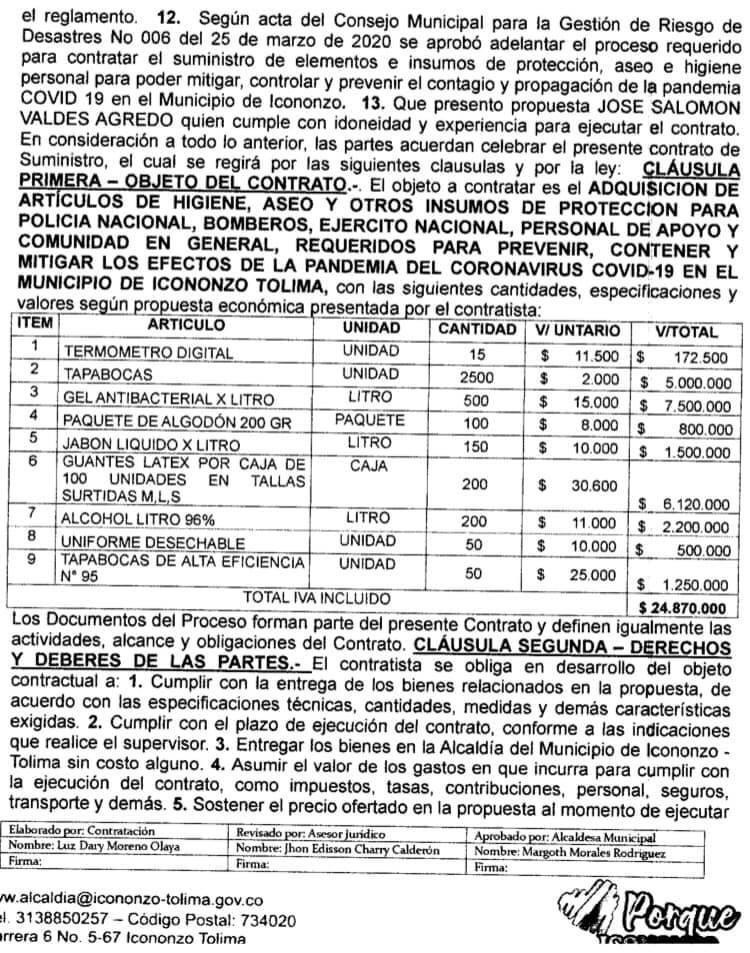 Algo similar ocurre con la alcaldesa de Iconozo, Margot Morales Rodríguez, donde se observa que los tapabocas tienen un costo igual a los de Cunday, con el mismo sobrecosto del 200 por ciento, pero el gel antibacterial rebaja a la mitad 15 mil pesos, pero en los demás artículos tienen sobre costos hasta más del 100 por cientos, como son los guantes, el alcohol, el jabón liquido y los uniformes desechables.