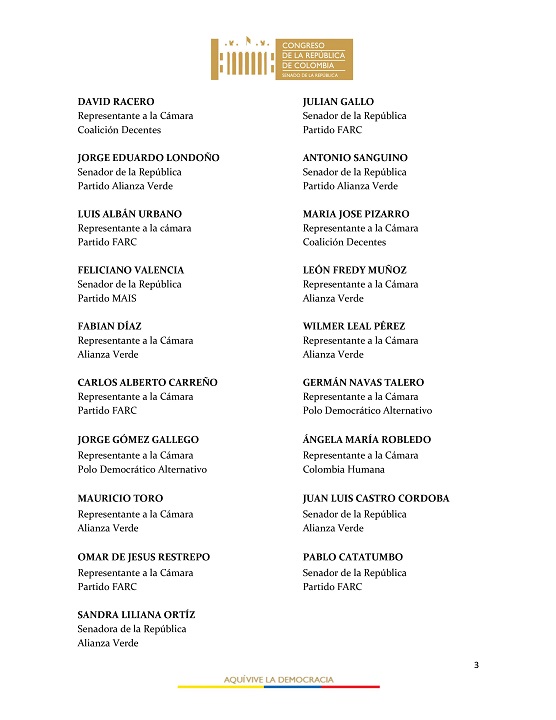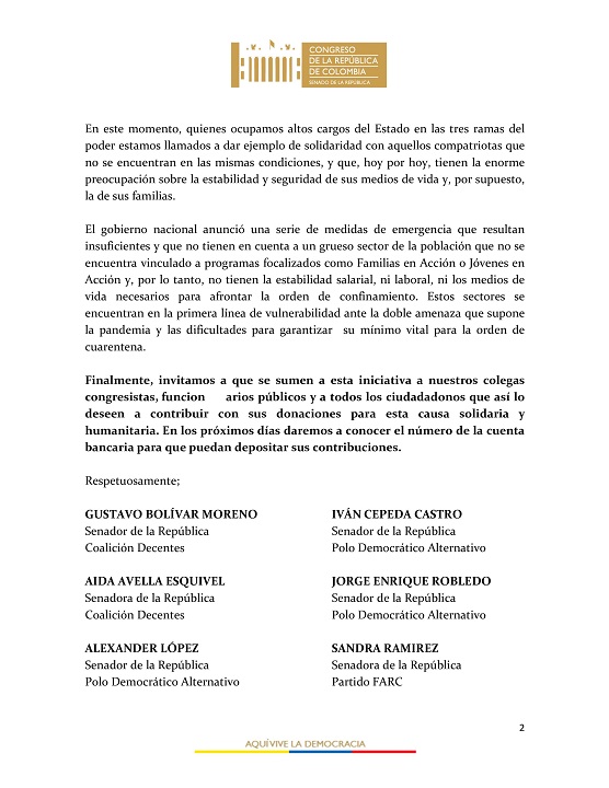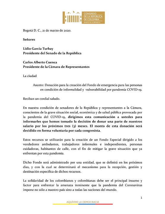 De acuerdo con la carta de los congresistas, cada Representante o Senadora tendrá autonomía para decidir el montó de sueldo que donará durante los próximos 90 días.