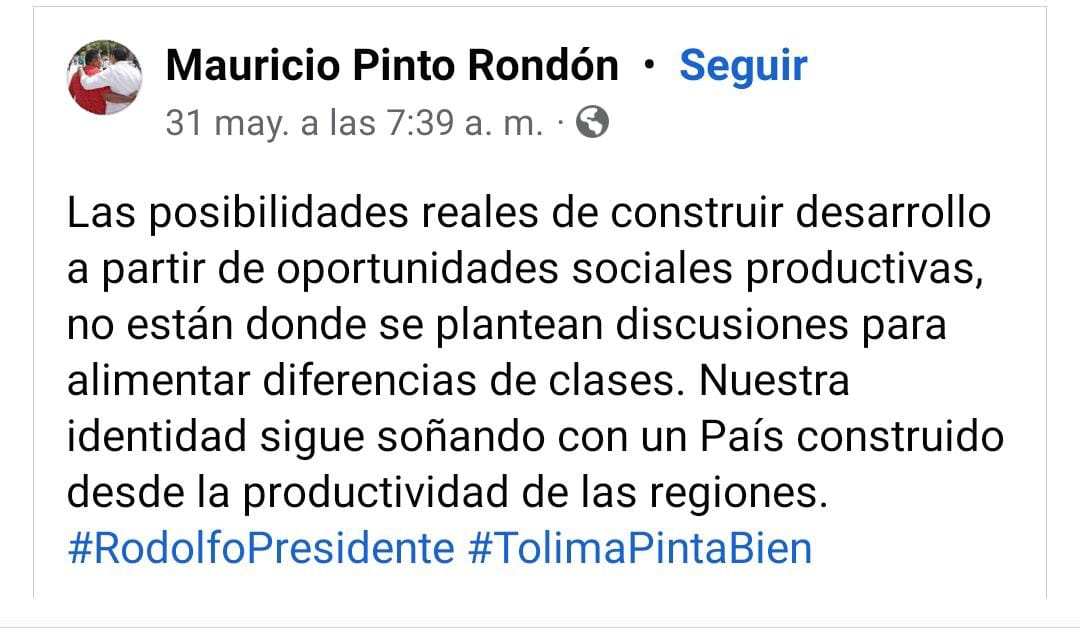 Por su parte, Mauricio Pinto hizo una publicación en sus redes sociales en la que declara su apoyo Hernández. "Las posibilidades reales de construir desarrollo a partir de oportunidades sociales productivas, no están donde se plantean discusiones para alimentar diferencias de clases. Nuestra identidad sigue soñando con un país construido desde la productividad de las regiones", comentó.