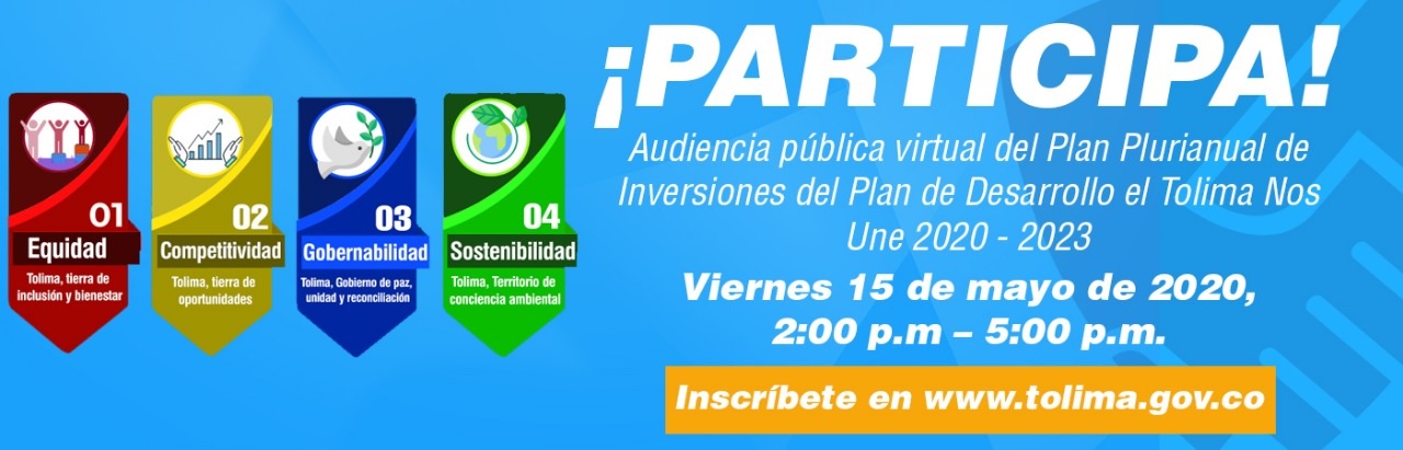 La iniciativa se hace en cumplimiento de disposiciones legales consignadas en el estatuto de la oposición política, normas del Ministerio del Interior y siguiendo protocolos de aislamiento preventivo ordenados el Gobierno Nacional; en tal virtud, la cartera de Planeación y TIC Departamental tiene programada este viernes 15 de mayo de 2020, de 2 a 5 de la tarde, el desarrollo de la Audiencia Pública Virtual Participativa de presentación del Plan Plurianual de inversiones en el marco del Plan de Desarrollo 2020-2023 “El Tolima Nos Une”.