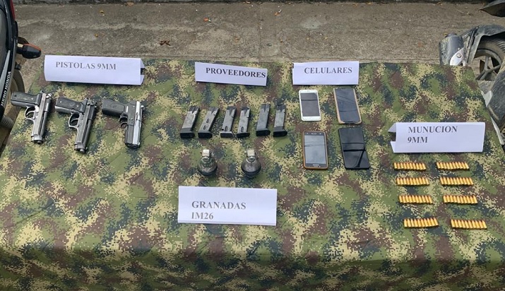 Al momento de realizar las capturas se les encontró en su poder el siguiente material: tres pistolas 9mm, seis proveedores de pistola, 80 cartuchos 9mm, dos granadas de mano, tres celulares diferente referencia, tres motocicletas de diferente cilindraje. Elementos los cuales posiblemente serían empleado para realizar atentados terroristas en contra de la fuerza pública, ciudadanía y asesinatos en el sur del Tolima.