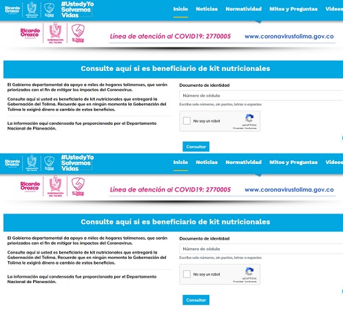 Desde el sábado 18 de Abril, la Gobernación del Tolima dispuso en la página oficial www.CoronaVirusTolima.gov.co una sección especial en la que los ciudadanos, digitando su número de cédula, podrán verificar si han sido seleccionados para recibir Kits alimenticios que la Gobernación ya está entregando.