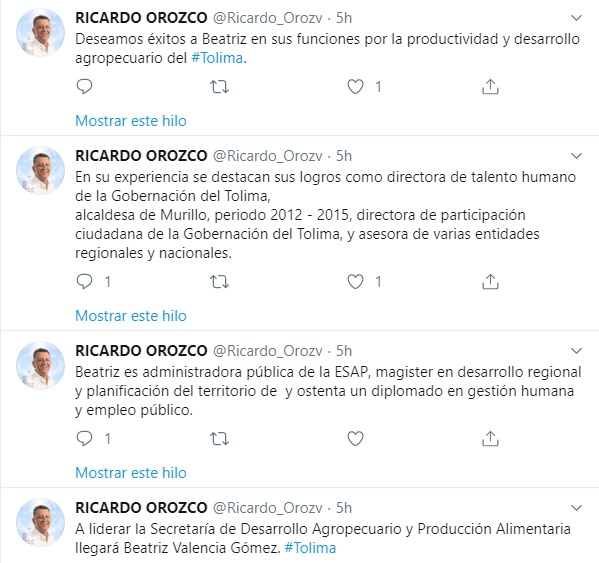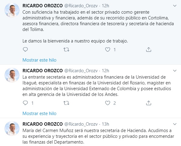 Este lunes el gobernador electo del Tolima, Ricardo Orozco designó a la administradora financiera, María del Carmen Muñoz como secretaria de Hacienda y a la administradora pública, Beatriz Valencia como secretaria de Desarrollo Agropecuario.