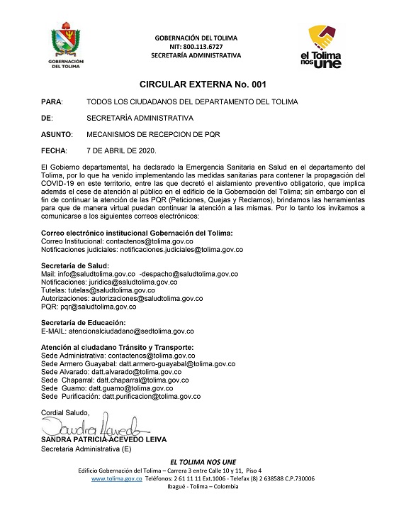 La secretaría administrativa recordó que los ciudadanos de cualquier región del departamento se pueden comunicar con la Gobernación del Tolima y recibir respuesta a sus peticiones a través del correo institucional contactenos@tolima.gov.co; al igual que los correos de diferentes dependencias, publicados en la Circular 001, del 7 de abril del presente año.