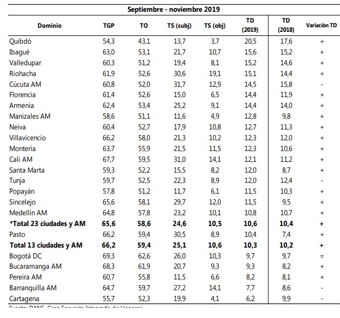 A su vez informó que lo corrido del trimestre septiembre- noviembre del presente año, Ibagué se sostuvo en este puesto a pesar de empleo que se obtiene después de las fiestas tradicionales del municipio.